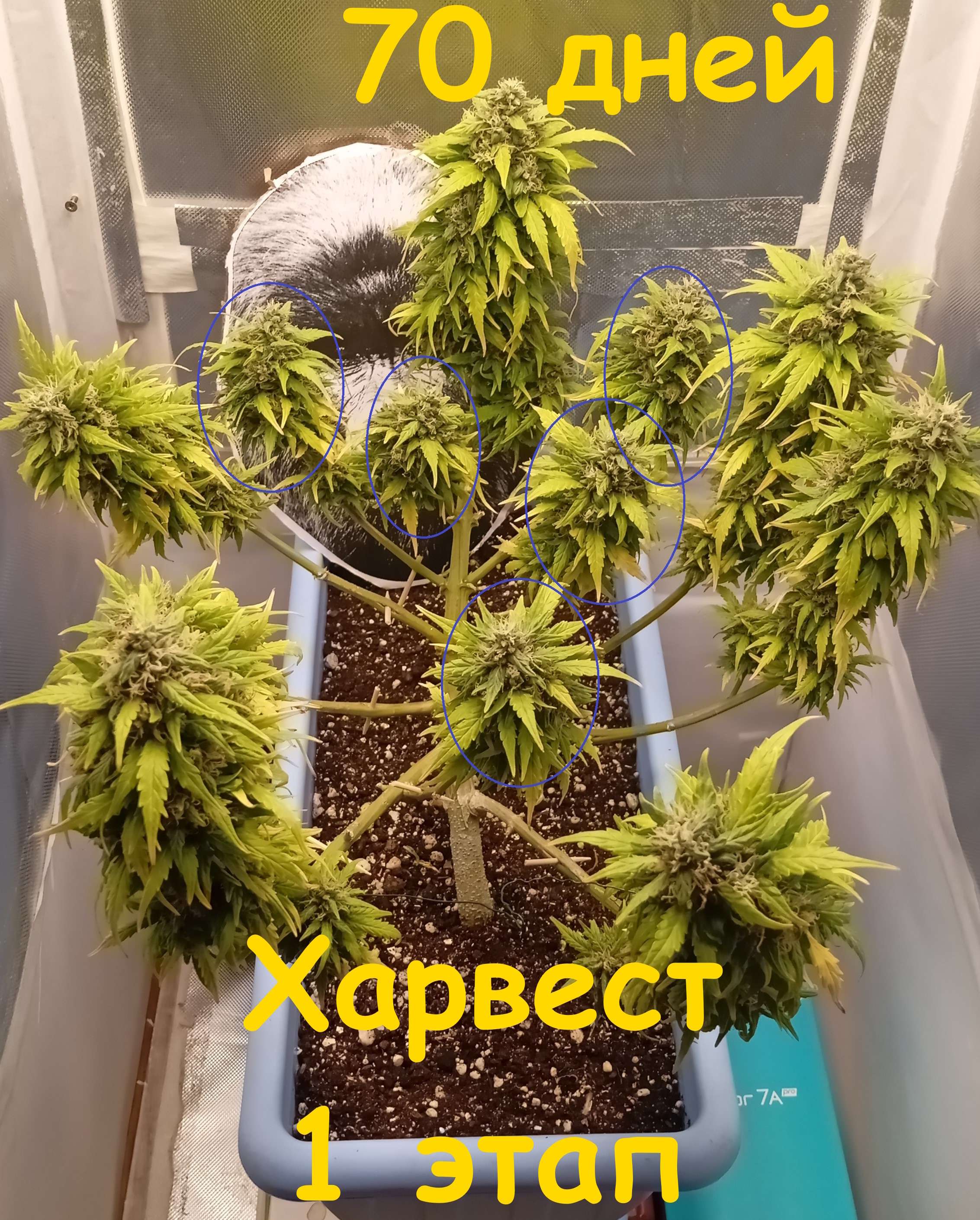 На 74 дне срезал 7 оставшихся основных кол, мутные трихомы с уже появившимся янтарём. Отправил в экспресс сушку.