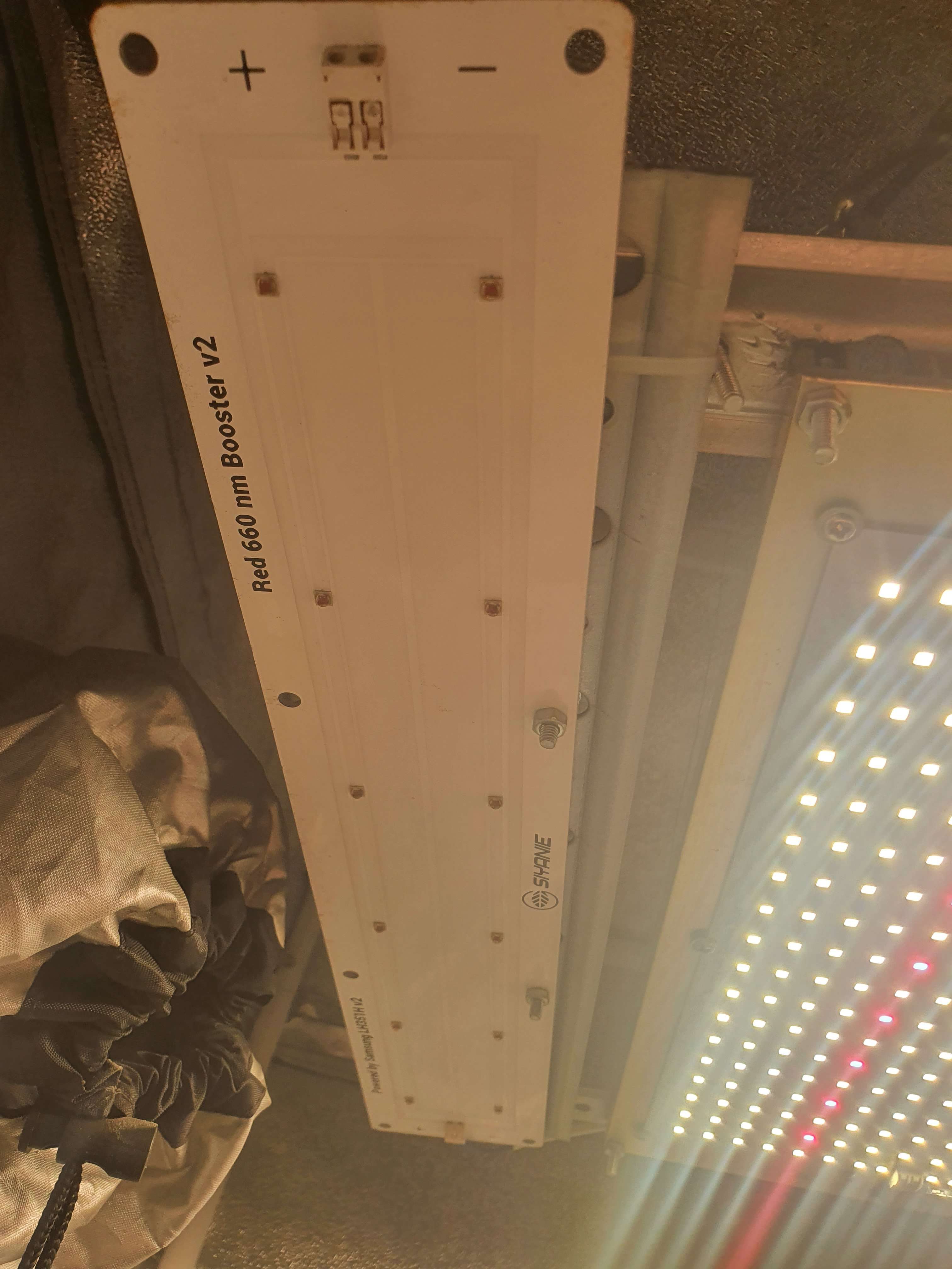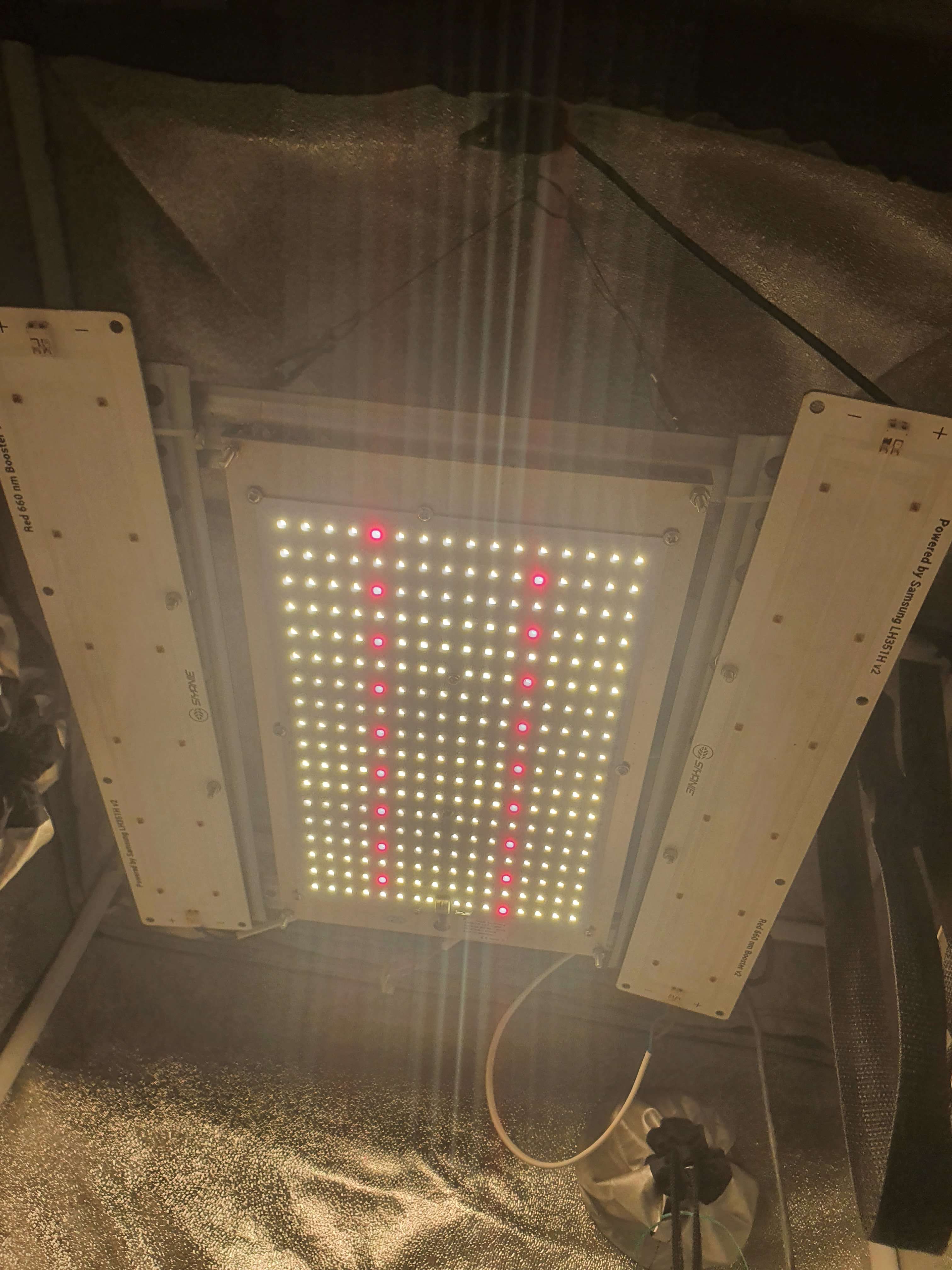 Квантумборд 3500К + 660nm (120Вт, диоды samsung lm301h) + 2 бустера 660nm (диоды samsung LH351H v2) по 15вт каждый, итого 150вт света, для 60х60 бокса в принципе достаточно (в итоге растишка переедет в бокс 80х80х160 со светом 390вт, но факстически с условием димирования светить будет 260вт).