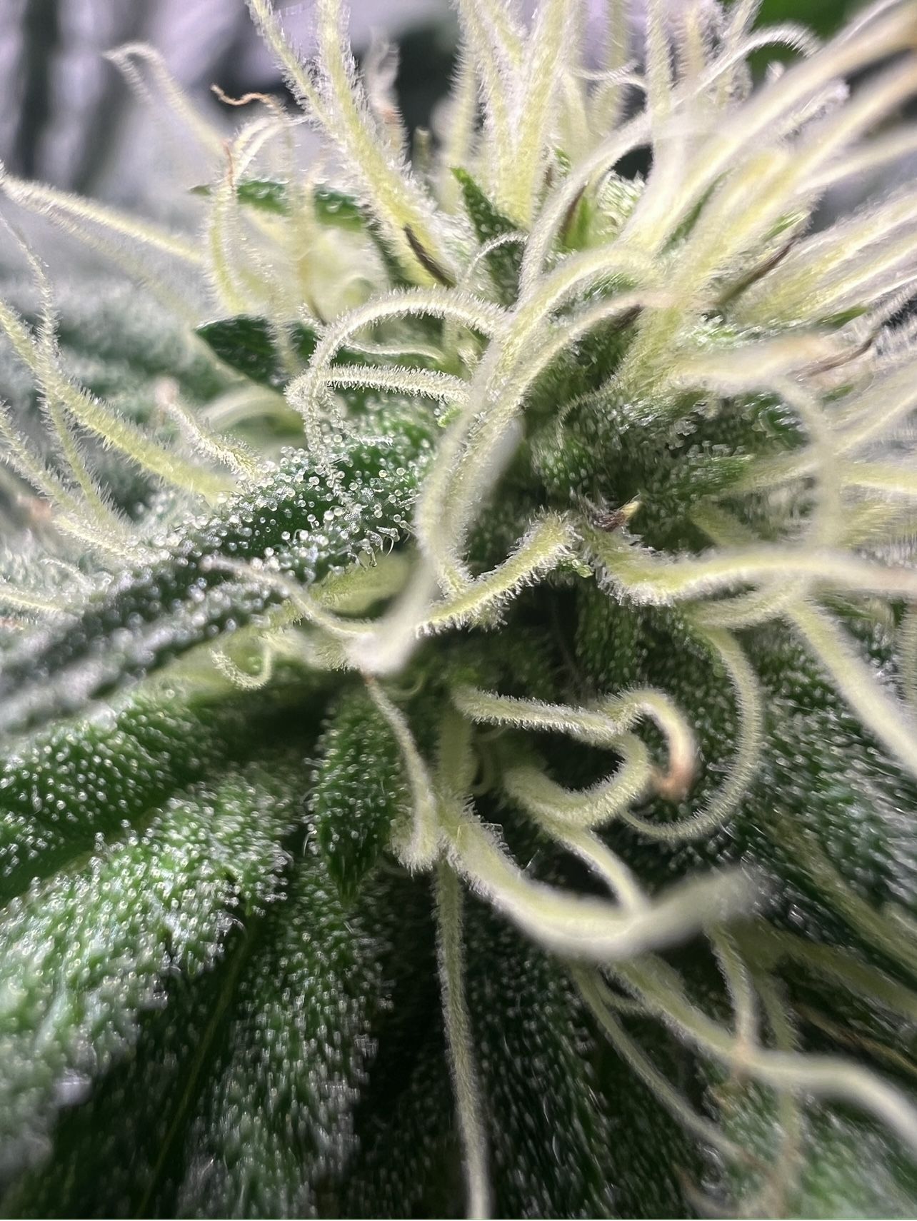Шишули начинают пухнуть и наливаться сахаром , маленькие трихомки , как маленькие детки смотрят своими глазенками и тянуться . Шишки достаточно липкие , на неделе сделала дефолиацию и убрала веерные без сахара ! Которые мешали пропускать свет и воздух. Сахарные еще пригодятся сделать гаш.