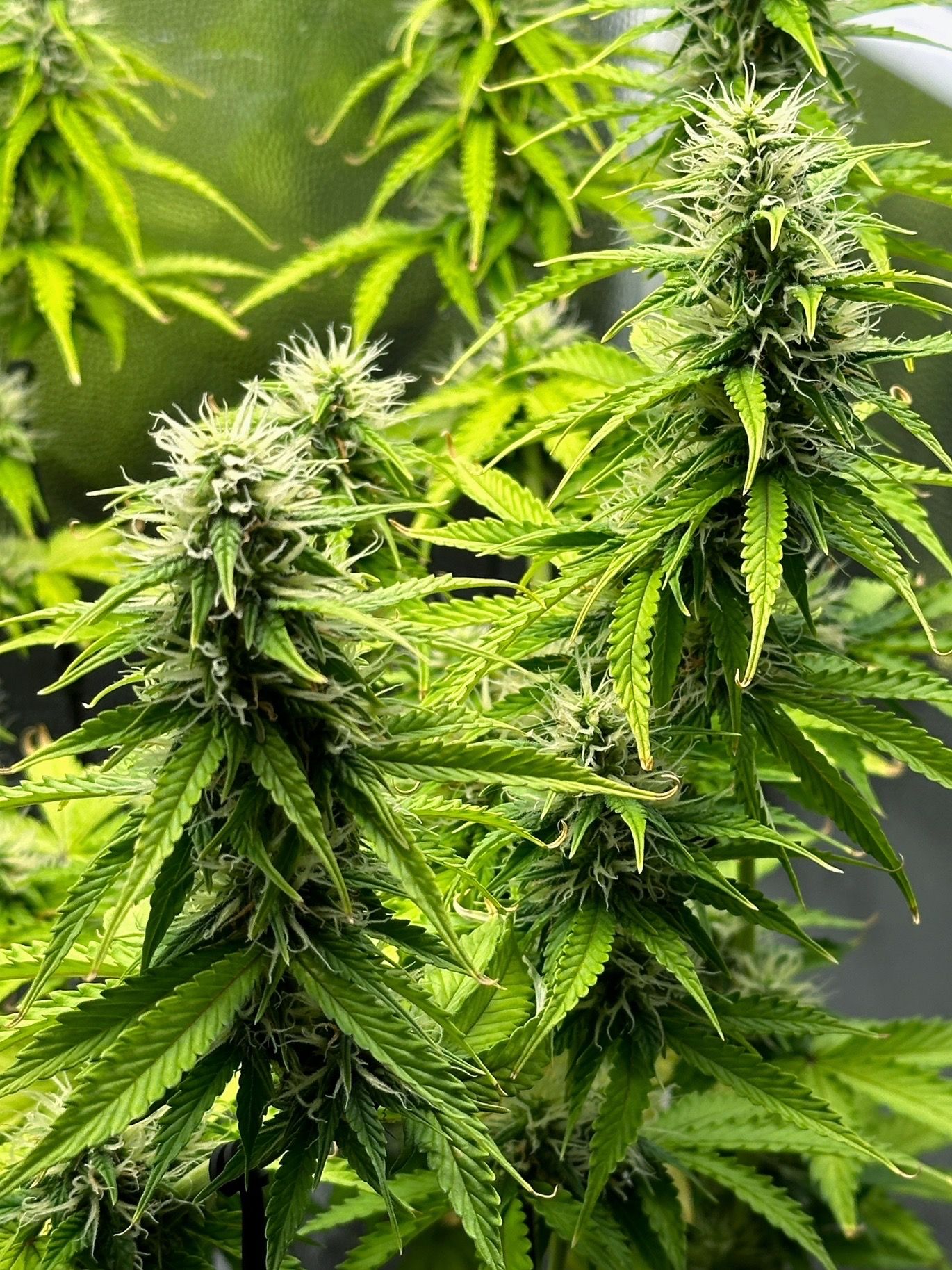 У тебя так из-за поливов случилось. Вот тот веерный лист который завернуло кверху означает что проблемы с поливом были или есть. Нужно проливать чтобы был дренаж, т.к. полив без дренажа это обычно в одно и тоже место вода/кампот идёт, как реки выбрали себе путь например. При поливе с дренажом горшок пропитывается полностью. Второе это быстрое пересыхание грунта при малом объёме грунта. Лучше тогда гроубег завернуть. Я растил в таком аэрпоте, каждый день поливать приходилось. Вес тоже нужно прибавлять, куст же растёт и прибавляет массу. А так доезжай как есть лучше, промывки не нужны, будет хуже. Листья хоть и обесцветились, но функцию свою выполняют, это лёгкое растения, их нужно беречь.
