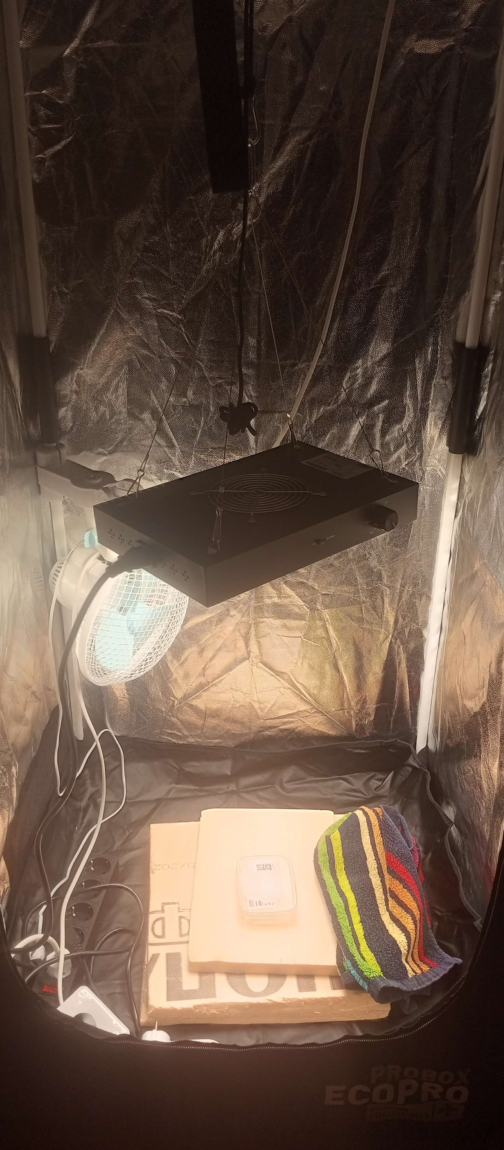 На данный момент семечко уложено меж влажными ватными дисками, по опыту прошлого взращивания, и создана температура в боксе, путем включённой ледлампы, 35 гр. +- 1 гр.