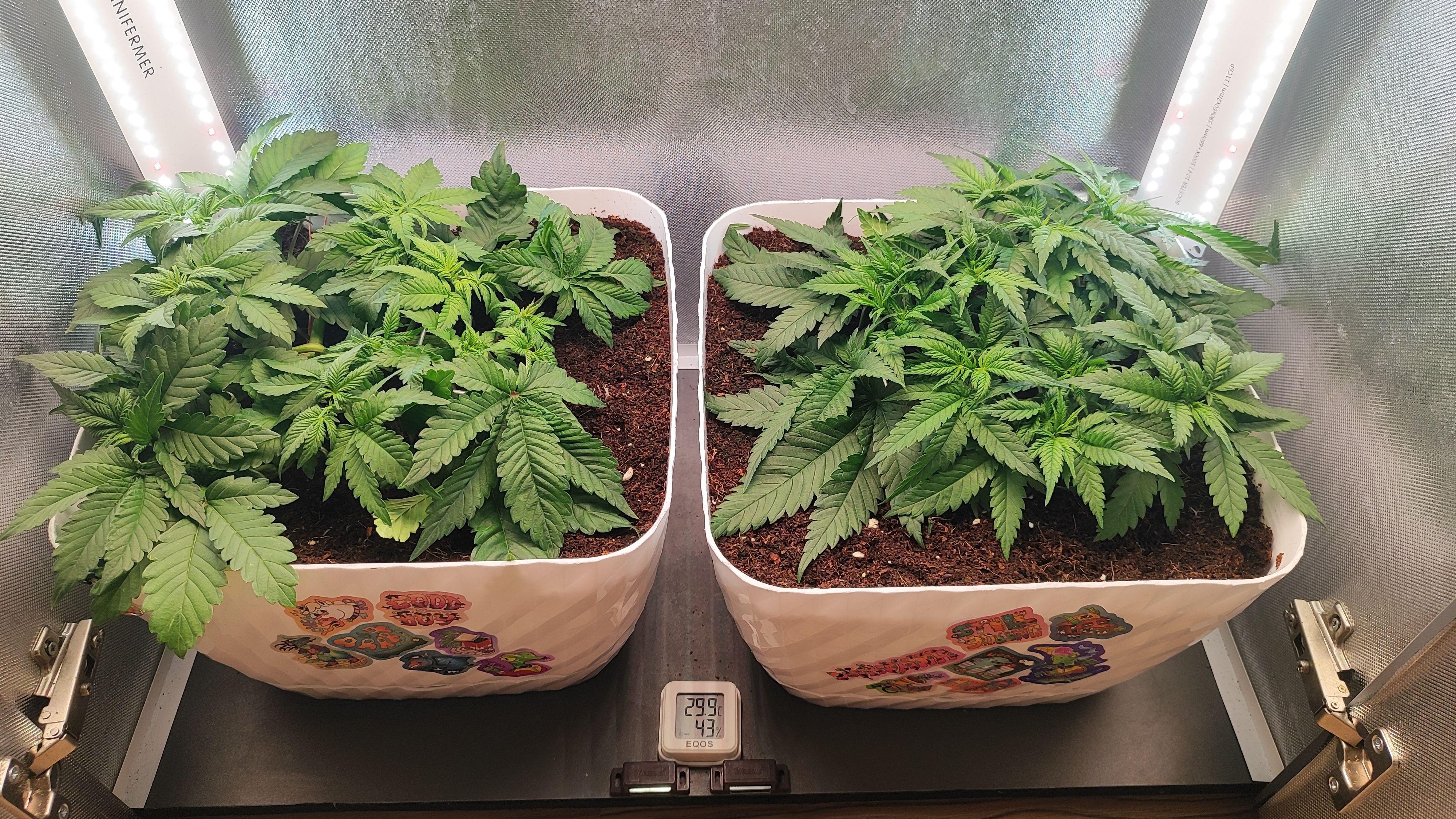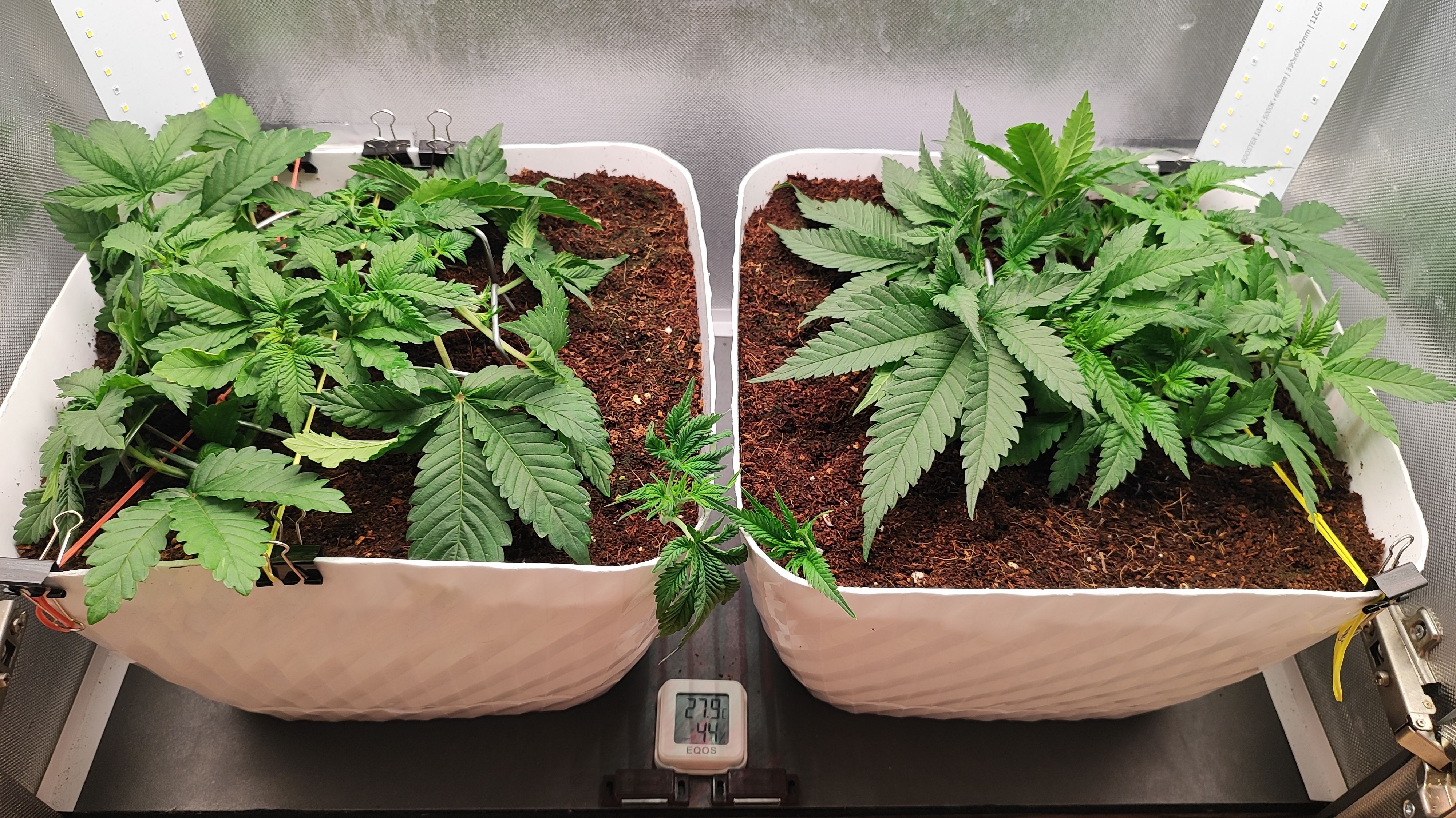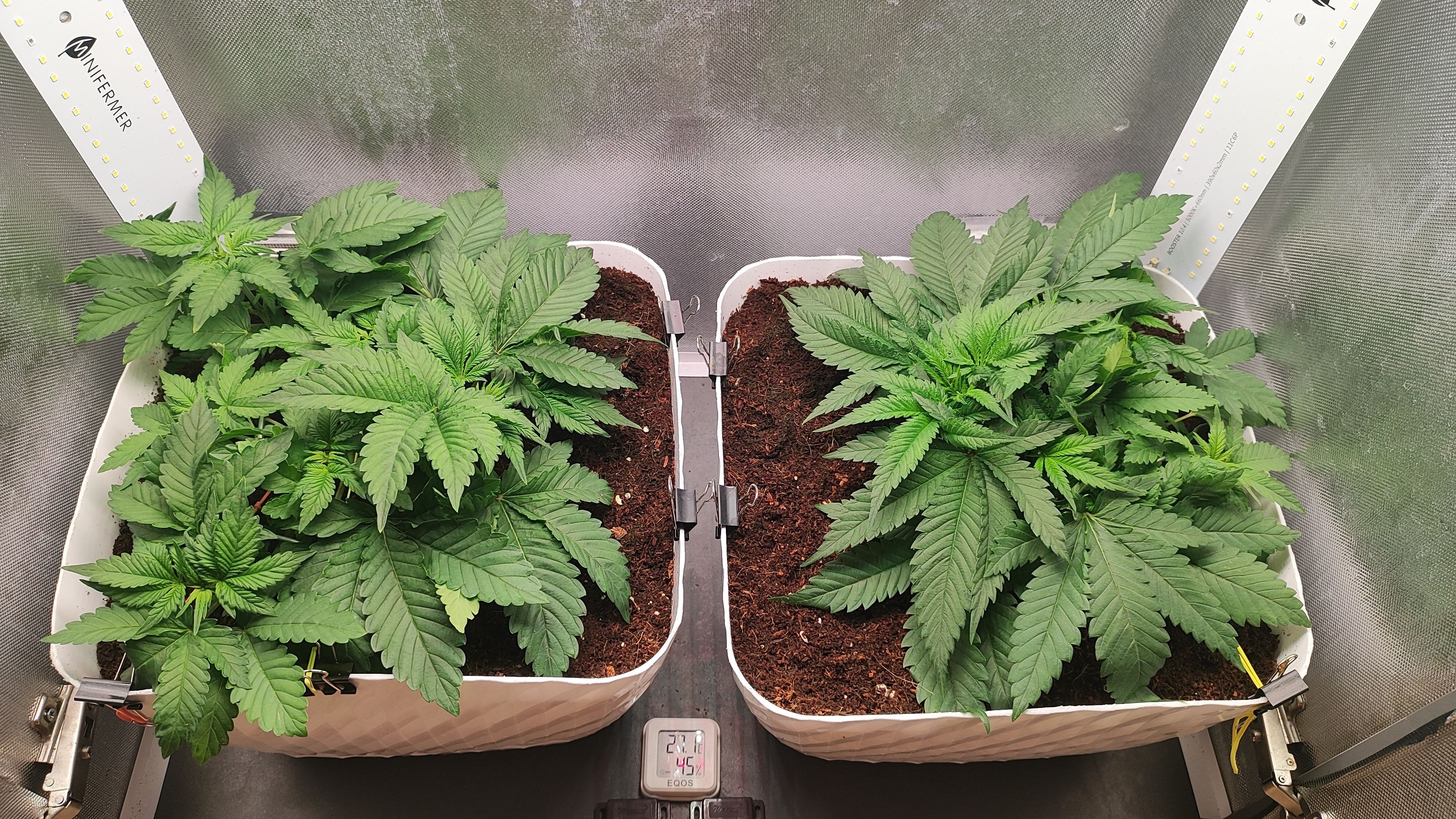 4 неделя позади. Растягиваю расту скобами. Обе топнул,предварительно у гориллы 11 точек роста, у мимозы 13. Посмотрю на дальнейшее развитие, возможно ещё уберу. Удалил все веерные листья, кроме пары крайних. На последние деньки веги включил досветы.