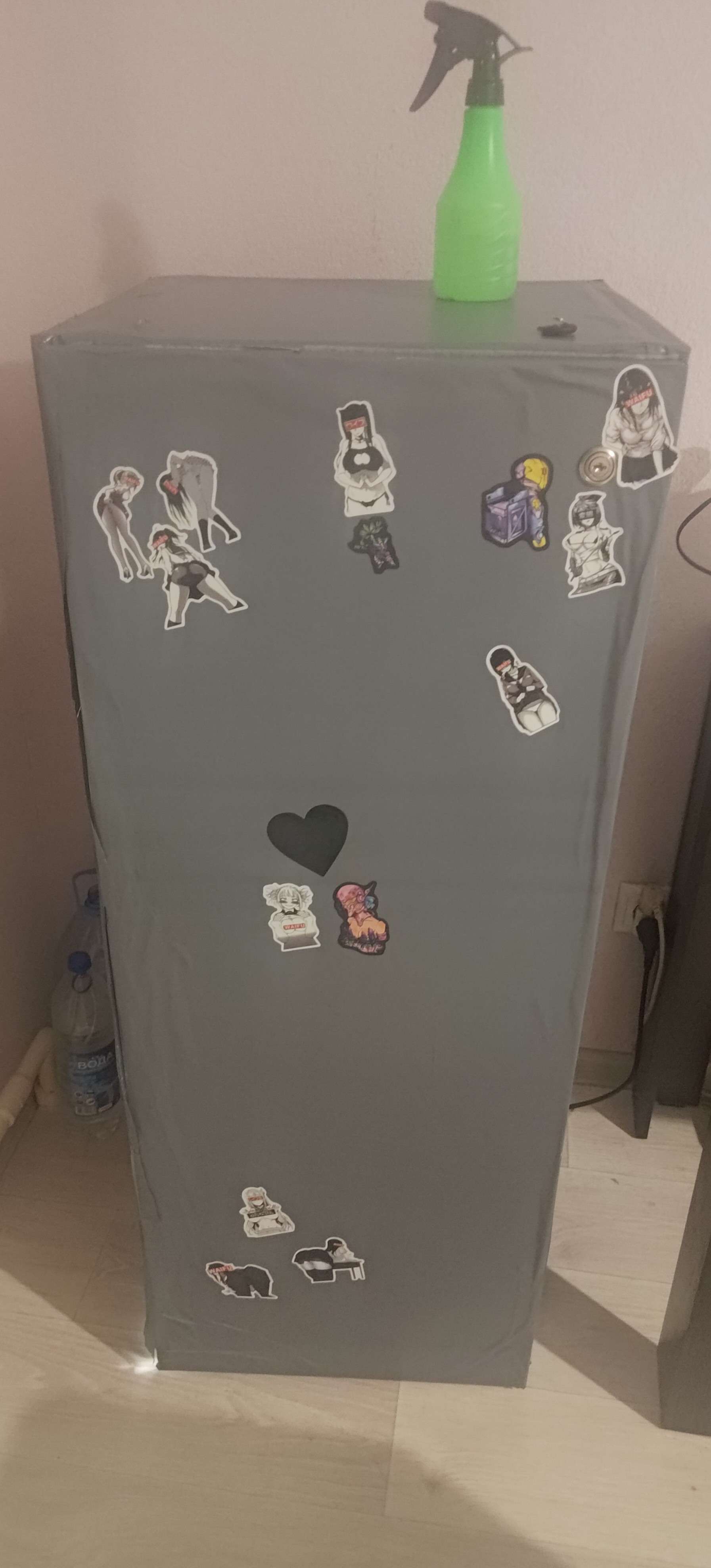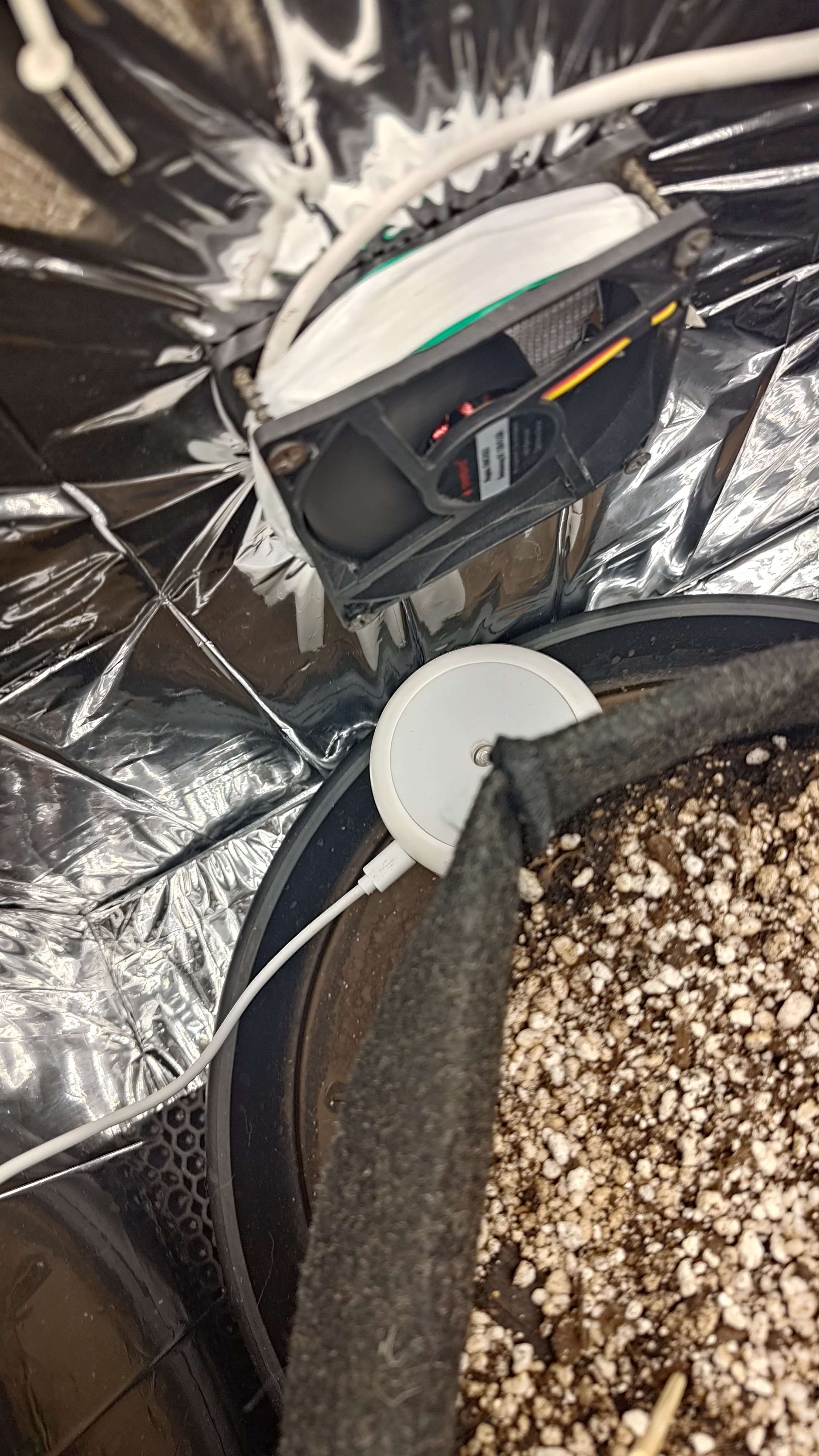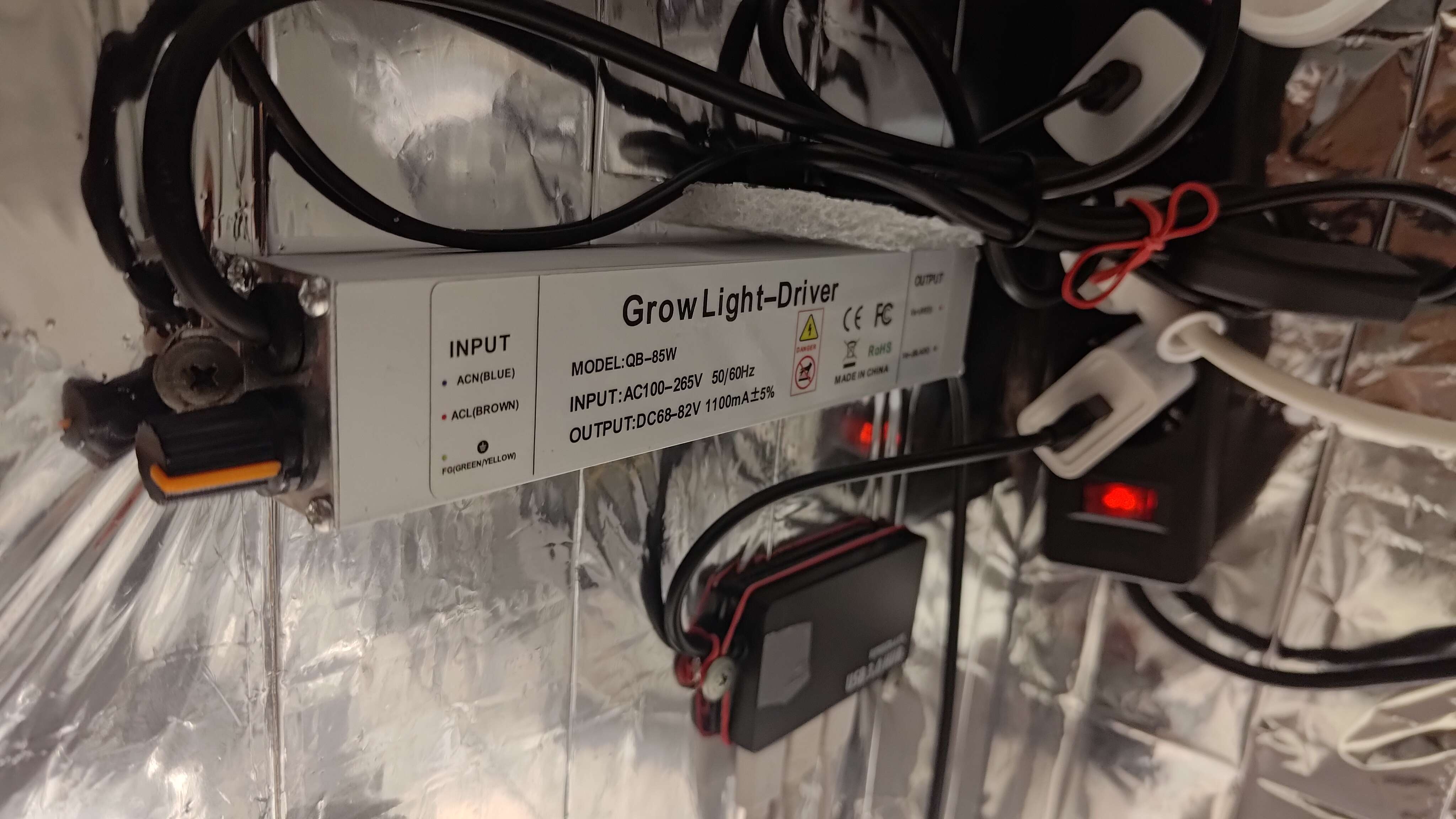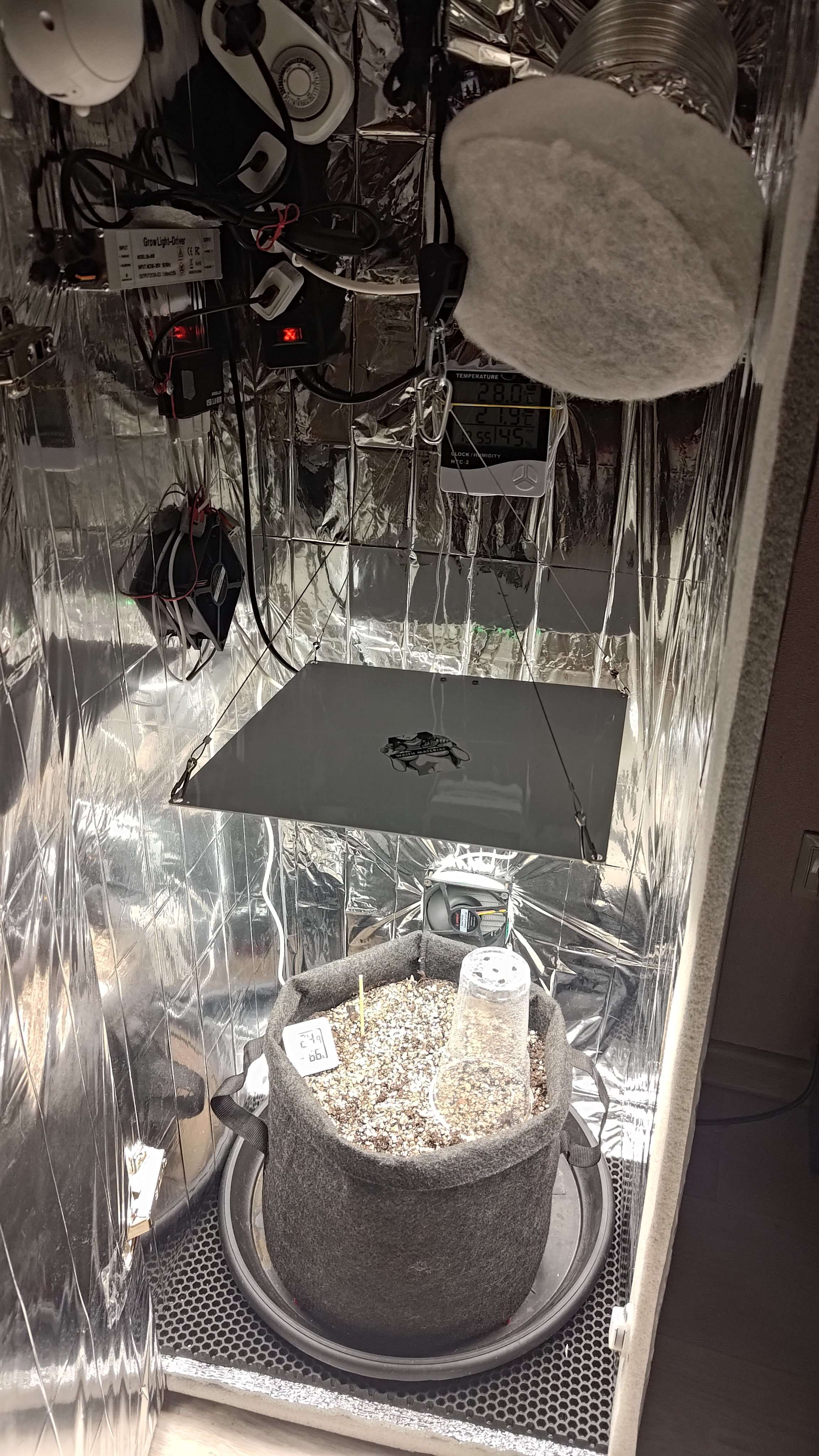 Собственно на этот гров был закуплен шкаф, обклеен майларом из фикспрайса, сделан угольный фильтр на ~900гр, 1 вент на обдув, 1 на вход, 1 на выход, таймер, 2 гигрометра, пш-тдс метры, пш регуляторы (Ломонософ), увлажнитель воздуха скорее всего его будет мало (300мл), камера чтоб не лазить постоянно для отслеживания показаний, на ночь будет выключатся ибо делает себе подсветку для ночной съёмки, тканевый горшок на 15л, фаско роза+лимон+перлит по 5л, удобрения GHE Tripart hard water, корневин, Trihomazer и его величество Quantum board 85w с диммером, режимами Вега/цвет (Кстати на листочке зажигает красный свет, а на цветочке Вега свет) скорее всего Китай? Кто знает подскажите. :sorrywhat?