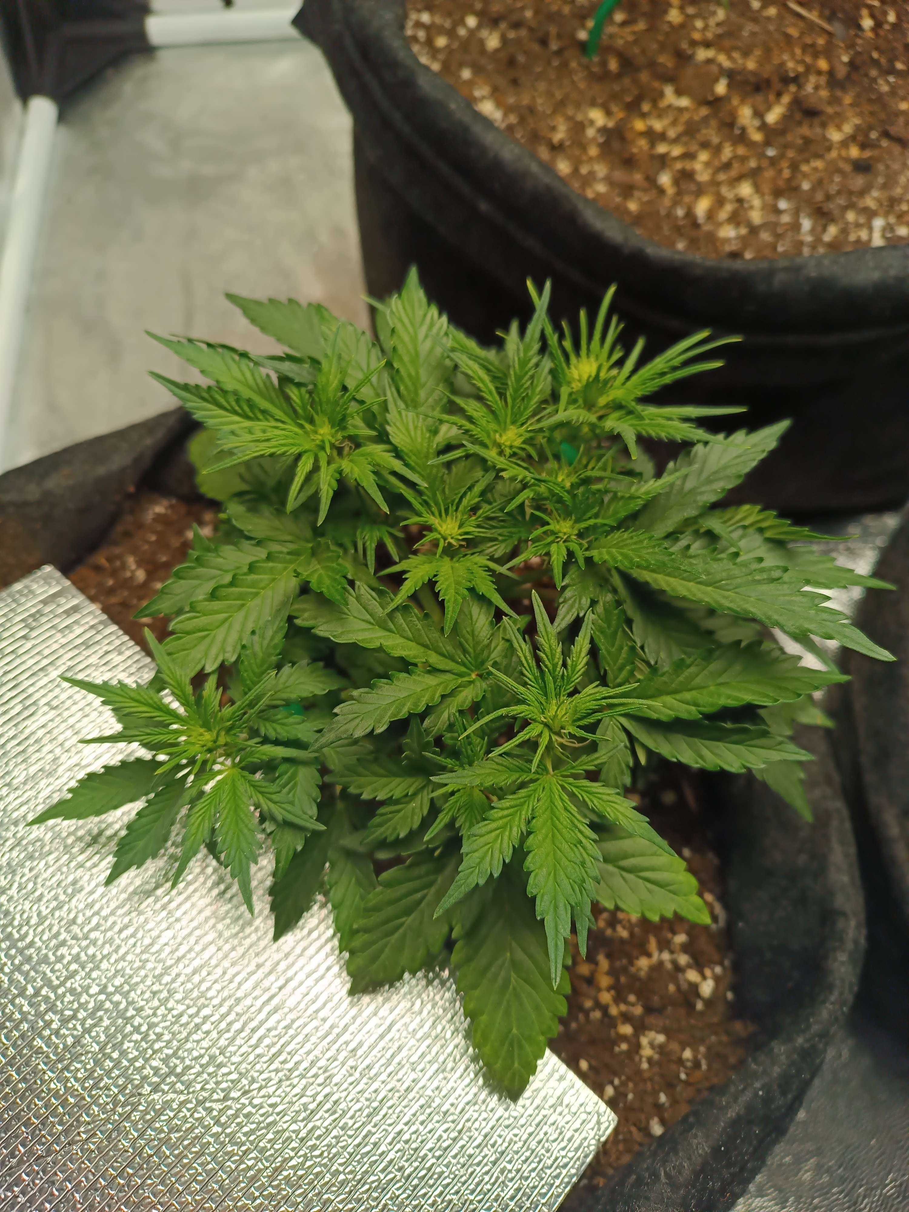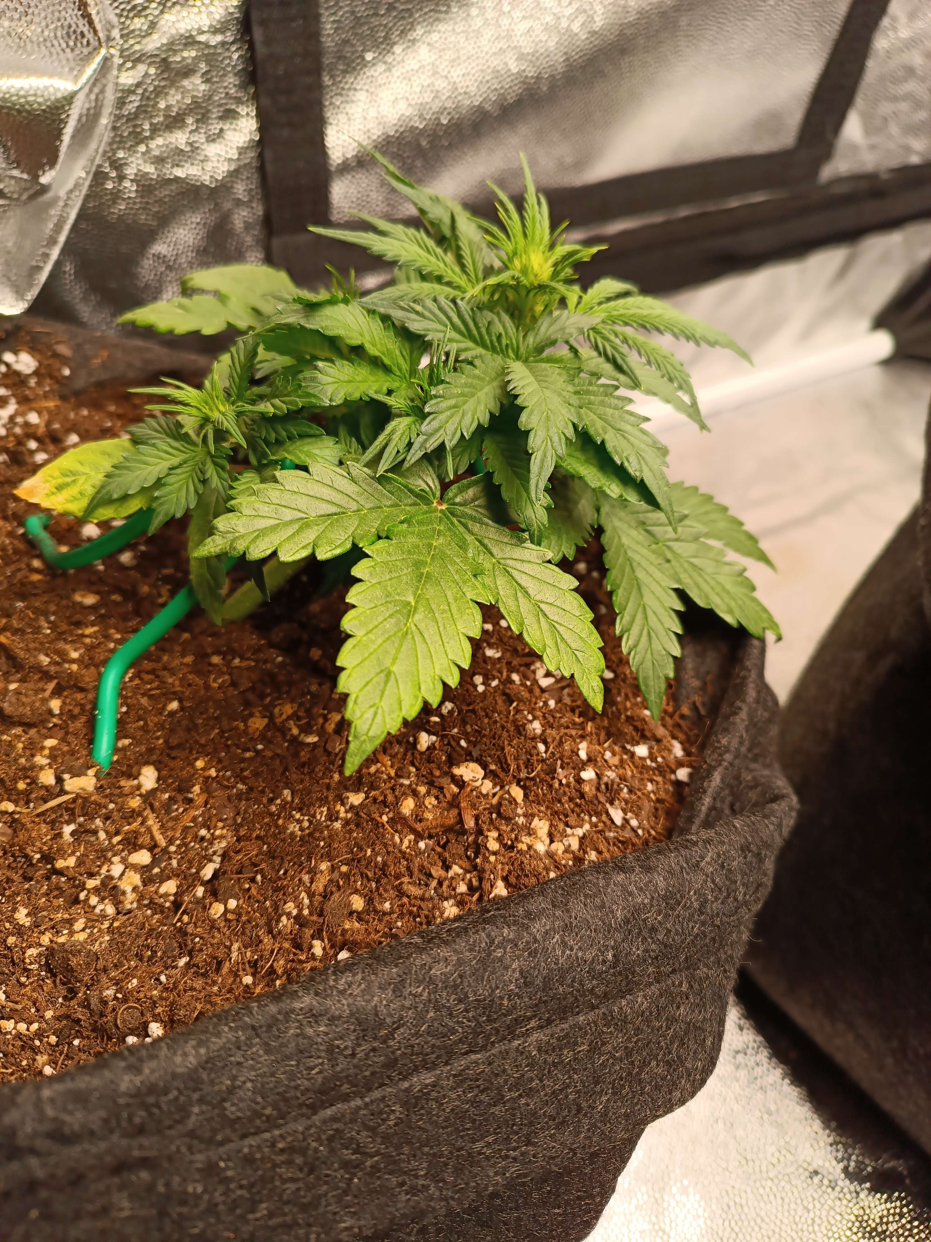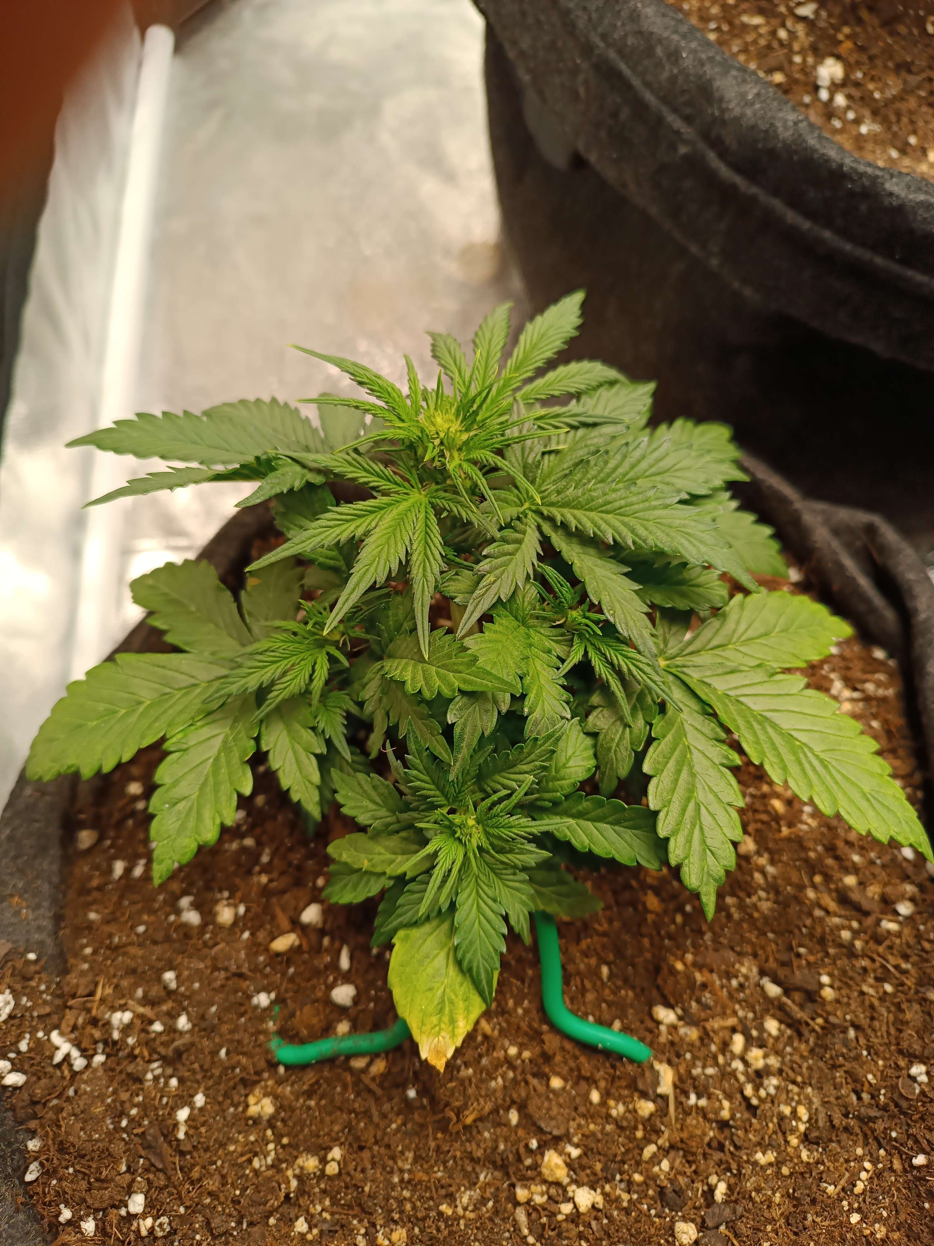 Начал давать полный комплекс удобрений для веги. Тянет удобрение хорошо, без ожогов. Начал активный низкостресс. Стебель аккуратно изогнут, все боковушки выведены на свет. Кустик становится плоским и широким. Ташкенти меня немного пугает своей густотой листьев и скоростью набора массы.