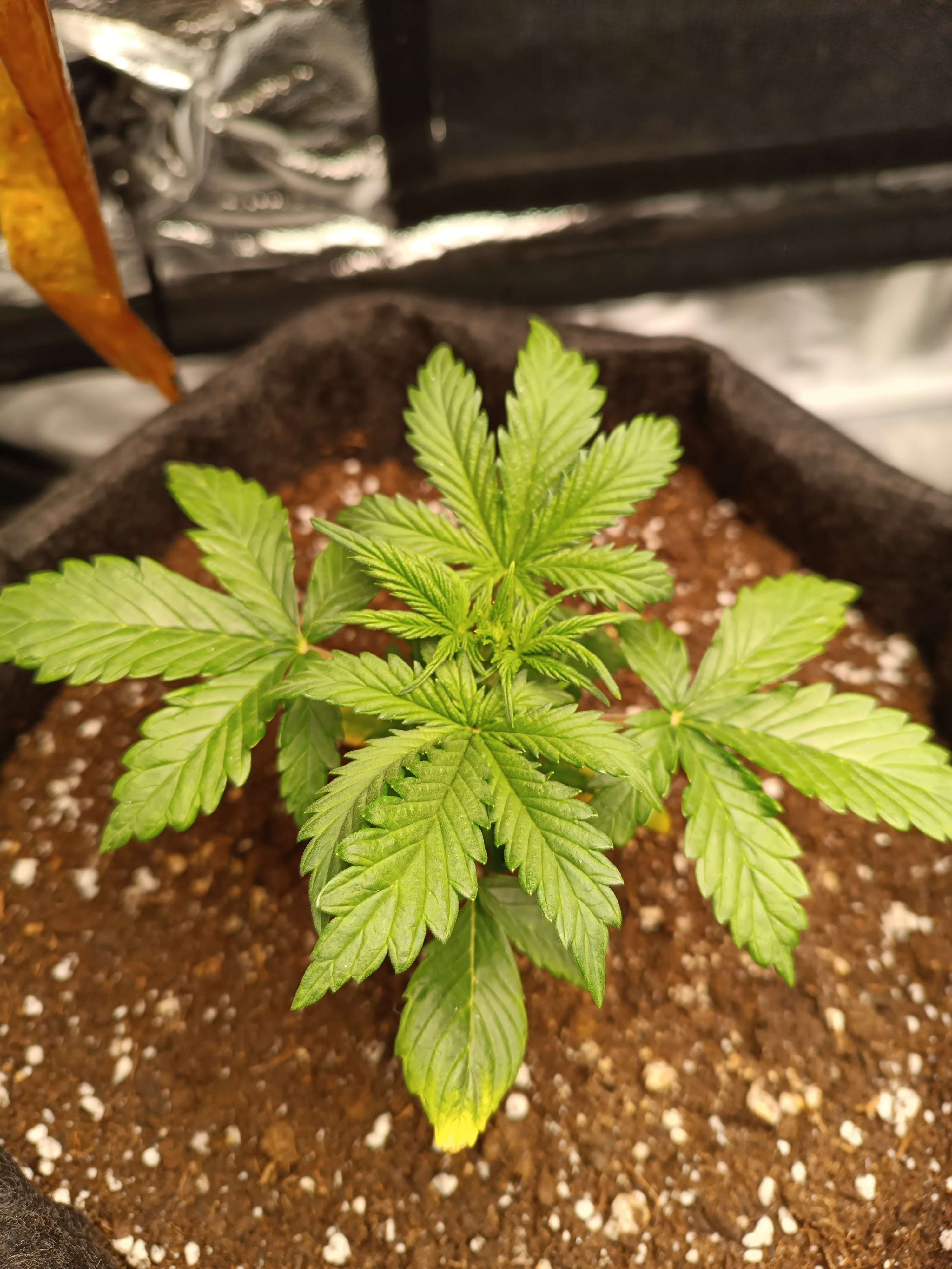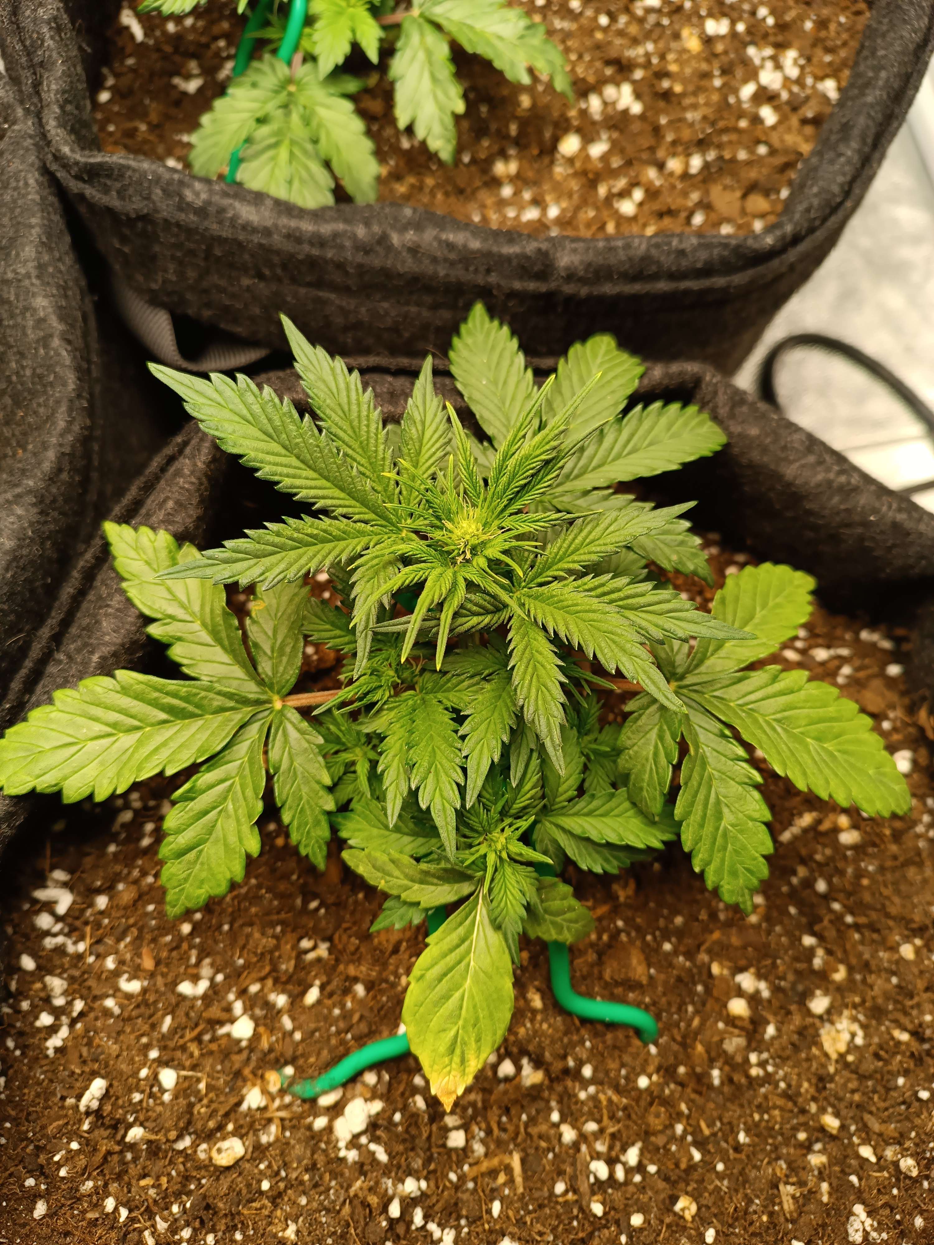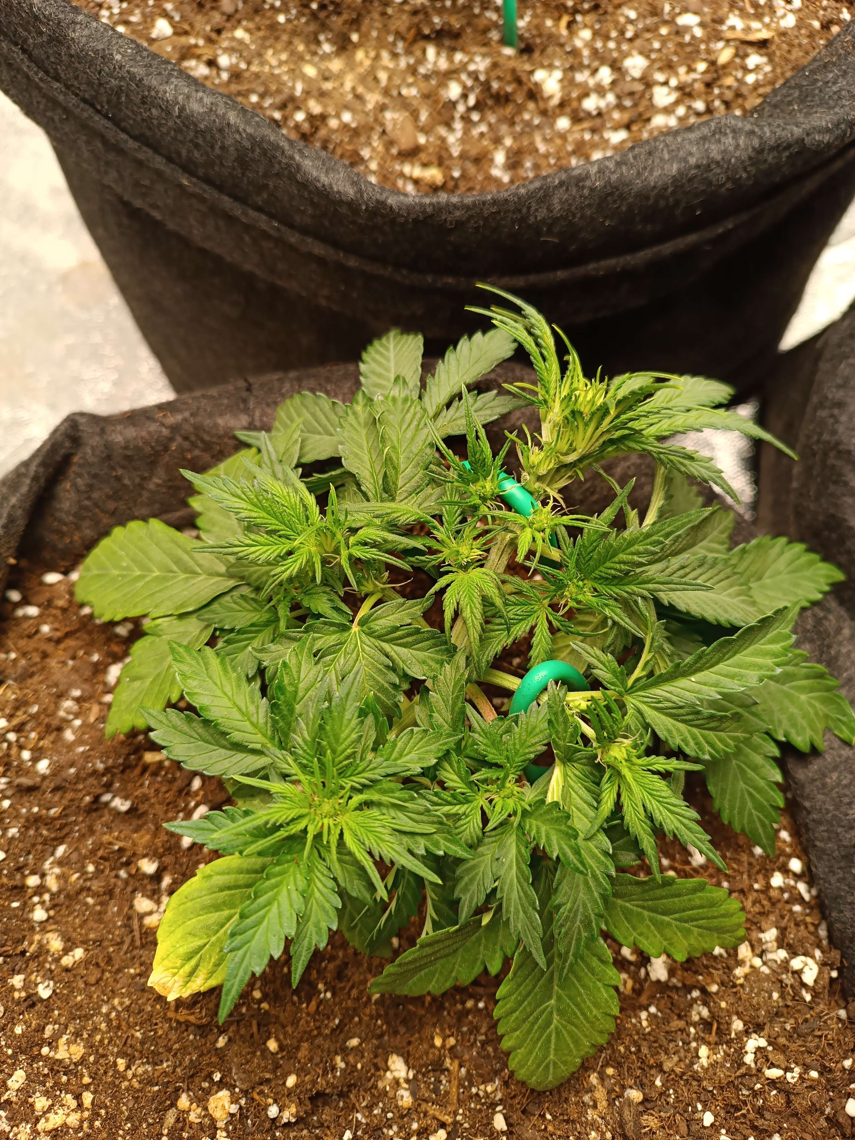Начал давать полный комплекс удобрений для веги. Тянет удобрение хорошо, без ожогов. Начал активный низкостресс. Стебель аккуратно изогнут, все боковушки выведены на свет. Кустик становится плоским и широким. Ташкенти меня немного пугает своей густотой листьев и скоростью набора массы.