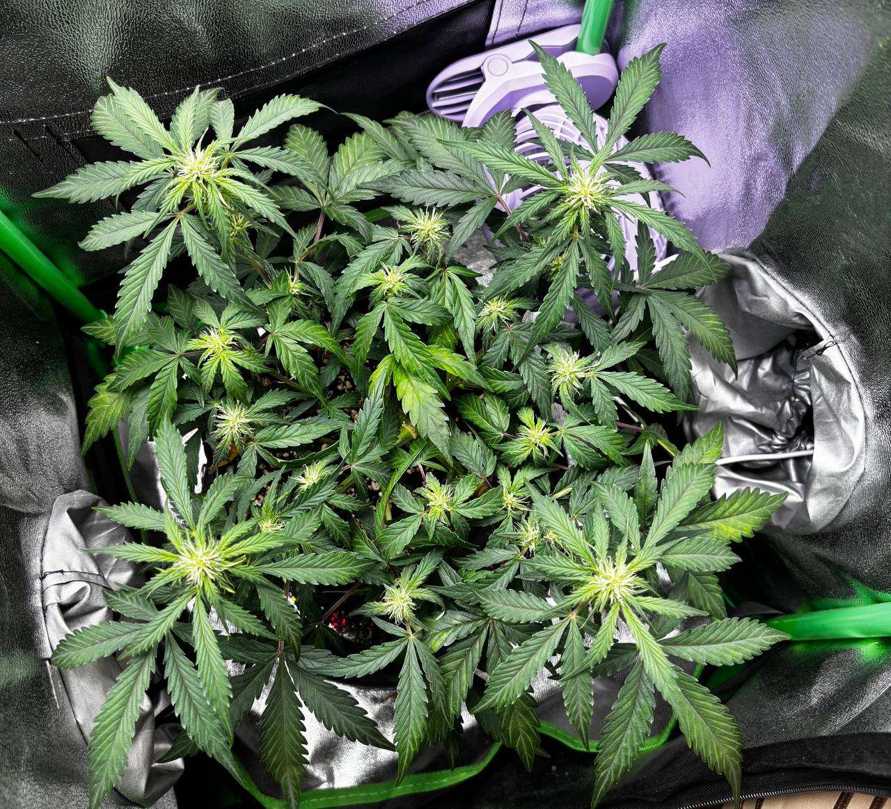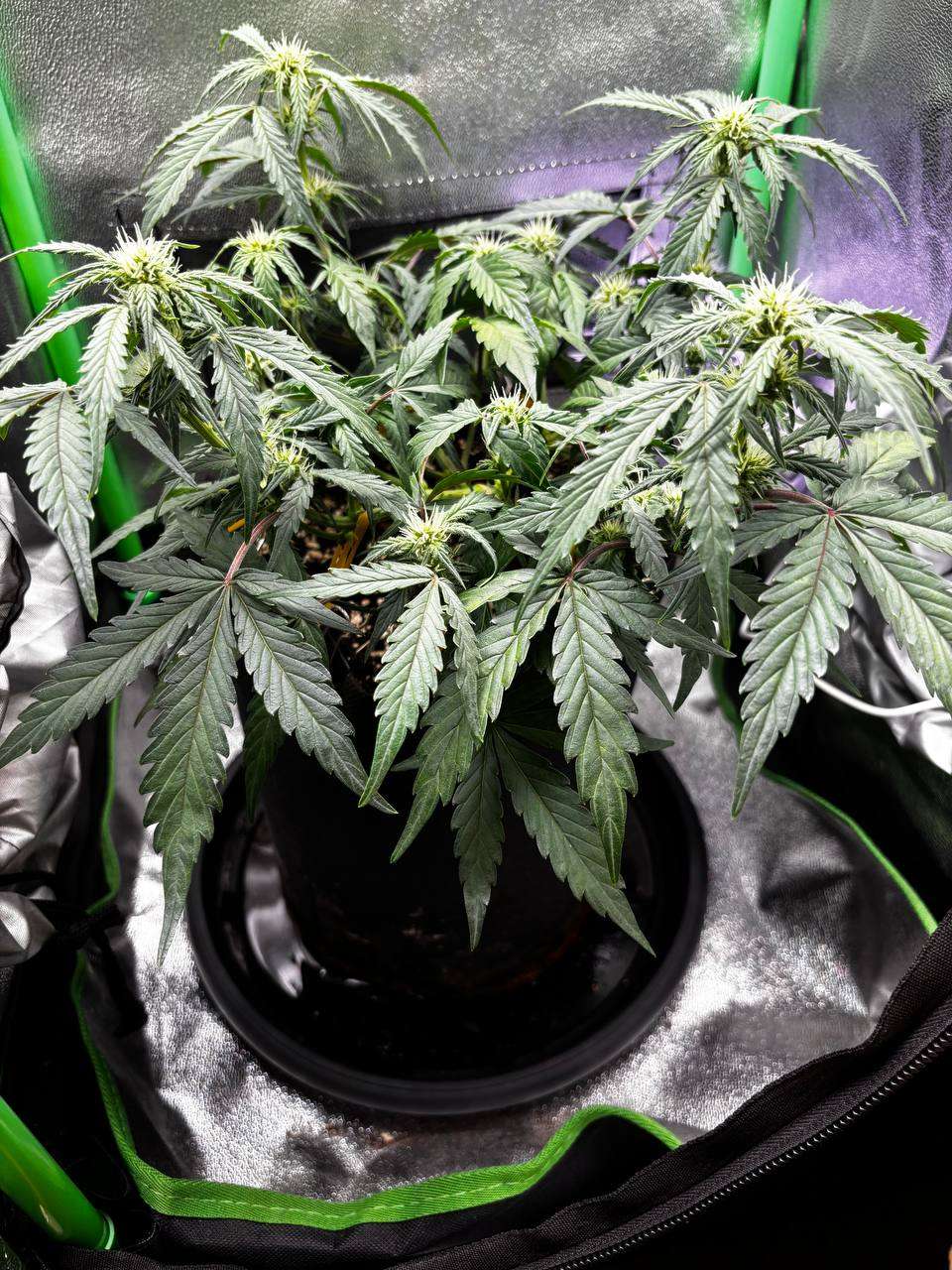 Пошла седьмая неделя, шишки пухнут. Вылезли болячки чутка, счел дефом кальция, так как ни разу не давал его за гров, в последнем поливе добавил чутка, посмотрим что да как будет. В целом все идет хорошо. :)