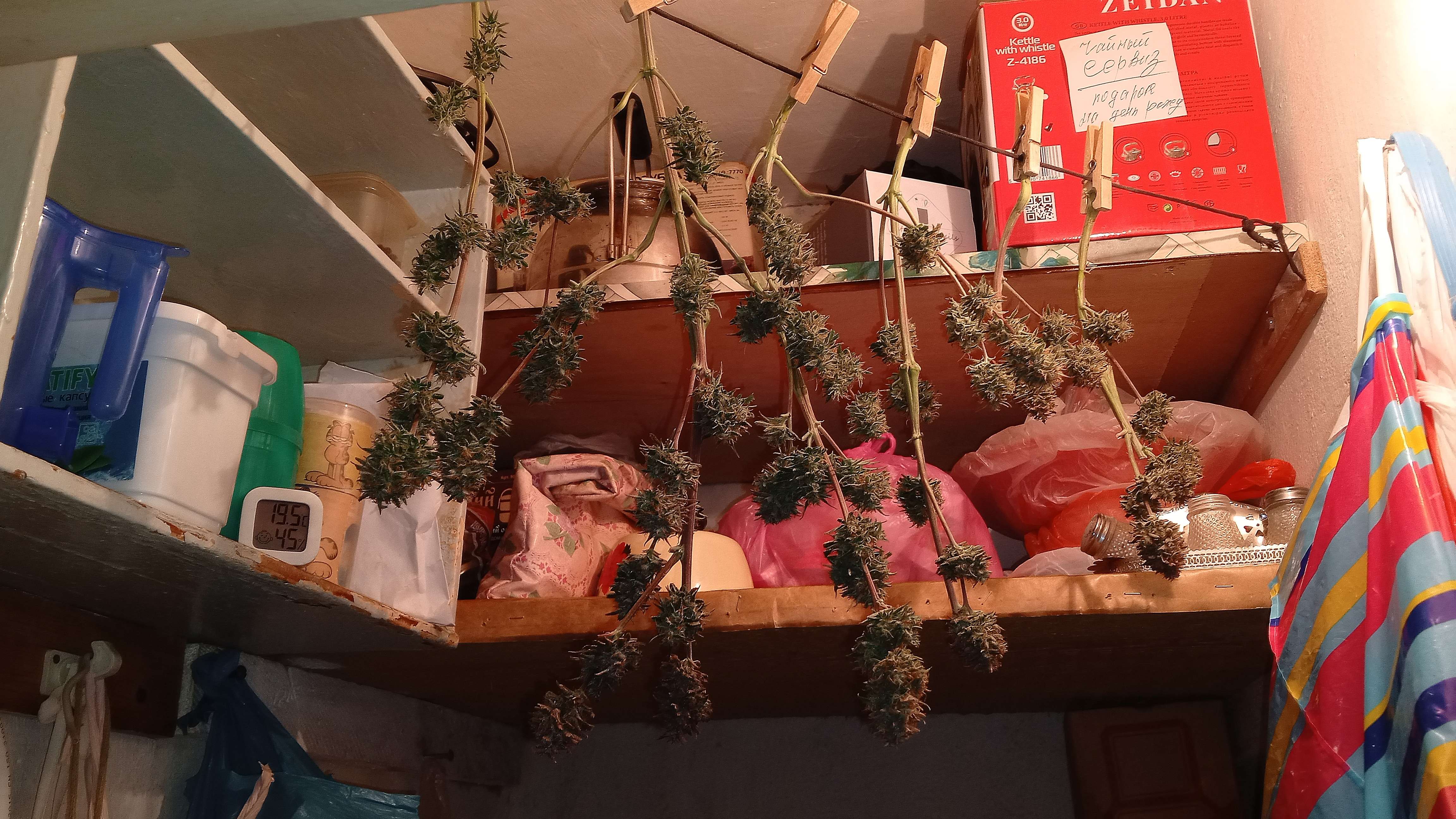 Морозец конечно накинул цвета на шишки. Надеюсь и по качеству покрепче стал сок. Лёгкий тримминг и сушка в чулане, на кухне.