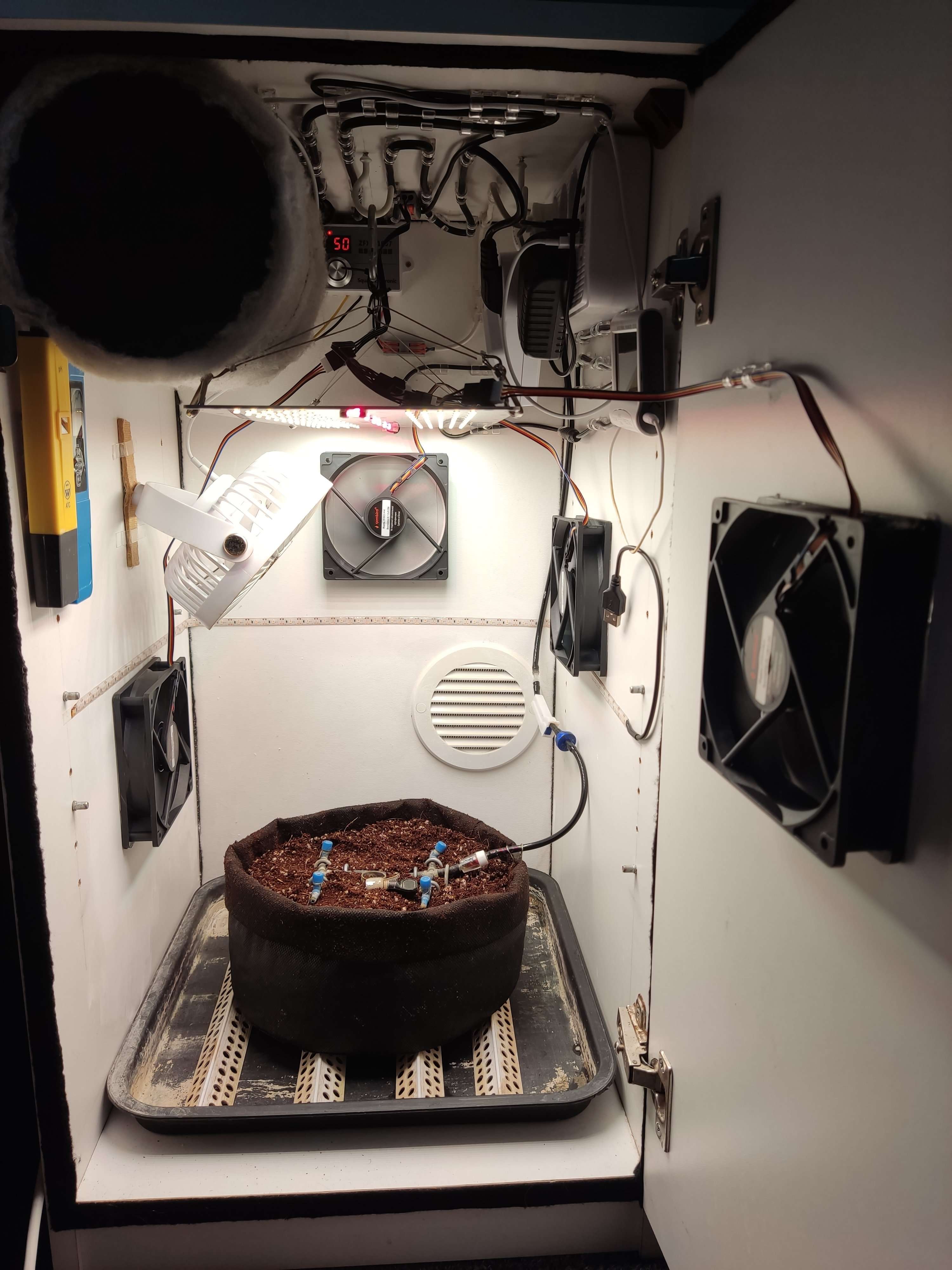 3). Были докуплены куллеры на каждую из стенок бокса, зафиксированы на разной высоте, для более равномерного обдува. В прошлый раз не хватило аэрации, появилась плесень в конце грова.