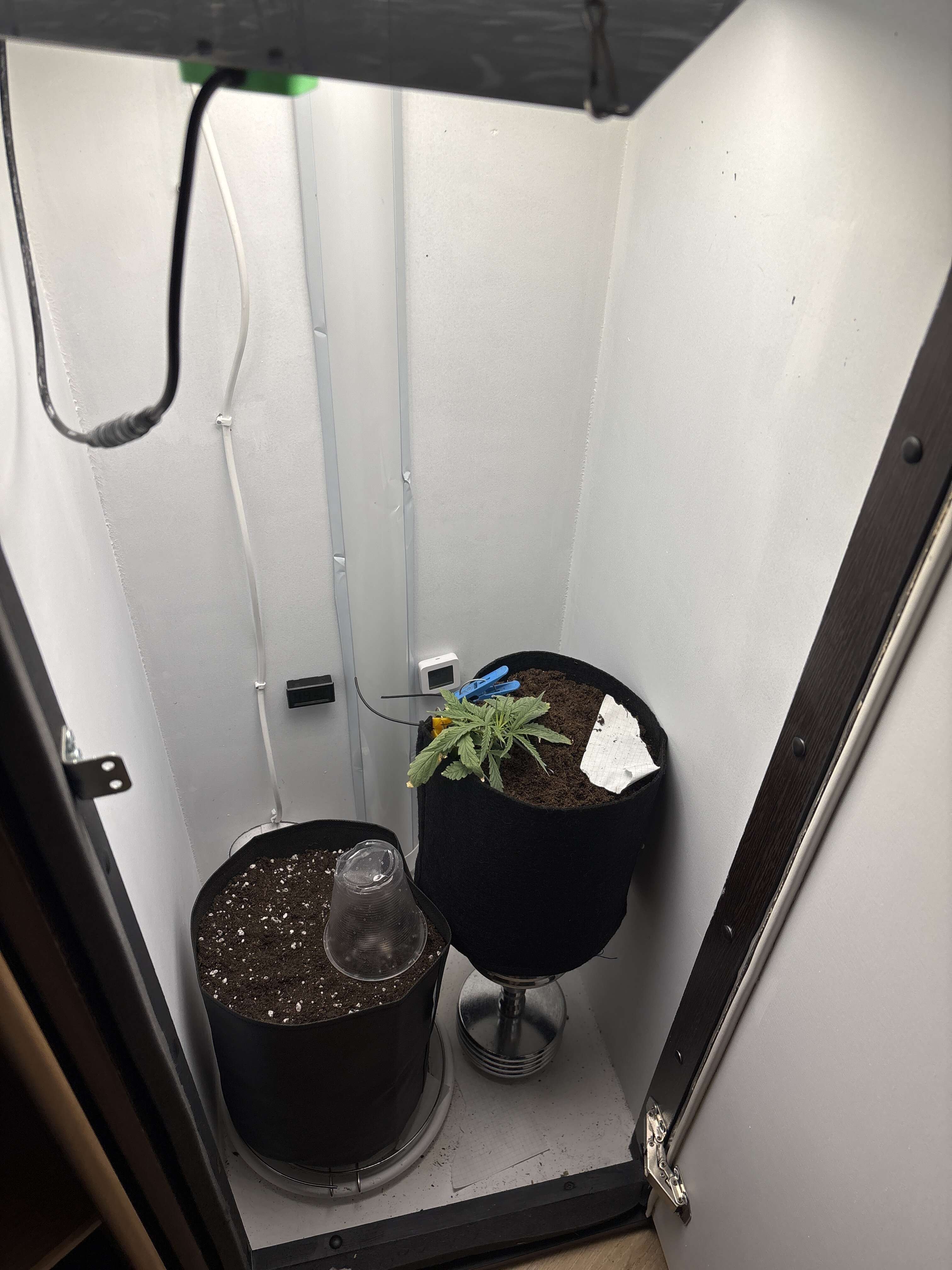 Второй вот прорастил в ватном диске , он дал корешок , засадил его в горшок 10 л , земля biobizz light mix , накрыл стаканчиком , слегка полил водой включил лампу 85 вт ( диммера нету ) , еще есть досвет 40 вт его не включалрасстояние 70 см